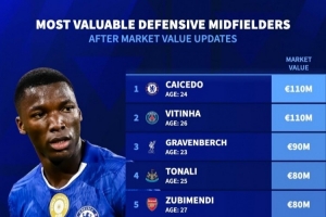 防守型中场德转身价榜:凯塞多、维蒂尼亚1.1亿欧居首
